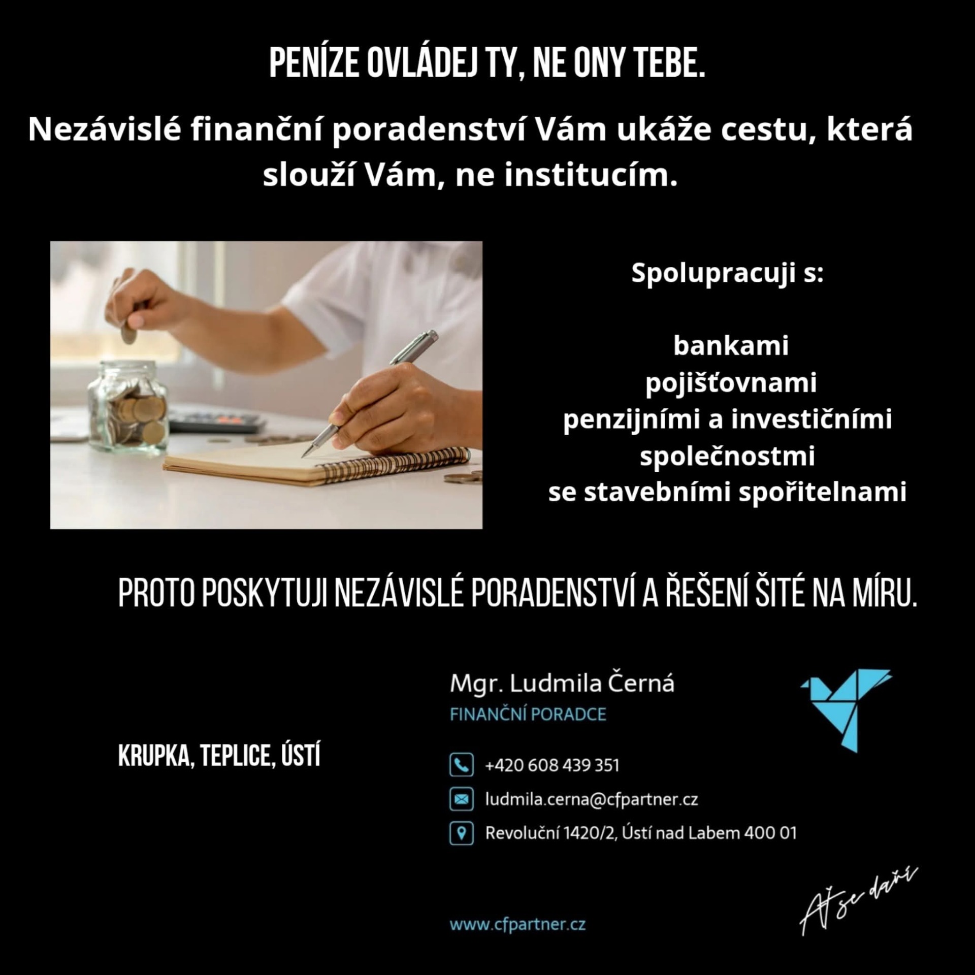 Mým cílem je, abyste se v oblasti financí cítili jistě a měli vedle sebe člověka, kterému můžete věřit.